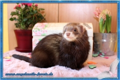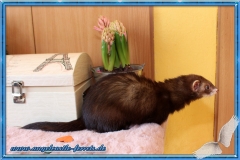 Banshee ist ein Traum von einem Frettchen. Wunderschön und superbrav. Sie ruht förmlich in sich. Sie ist sehr menschenbezogen, verlangt ihre Schmuseinheiten und gibt brav Küsschen. Selbst als Welpe hat sie nie fest gezwickt.
